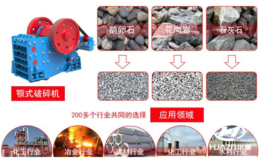 顎式破碎機主要適(shì)用於冶(yě)金、礦山、化工、建材、公路、鐵路、水利等行業,對各種礦石和大塊物料的中碎和細(xì)碎(suì),用於破碎不同硬度的岩石,例如河卵石,花崗(gǎng)岩,青石,石灰(huī)石等(děng)。被破碎物料的高抗壓強度為2000kg/cm2。