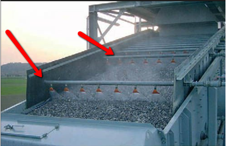 在產生粉(fěn)塵的入料口、出料口(kǒu)和破碎腔這三個主要部位設置(zhì)噴水裝置,每(měi)處各設置兩個噴水嘴。其中,入料口處兩個噴(pēn)嘴指(zhǐ)向入料口;出料口處兩個噴嘴相對(duì)形(xíng)成一定角度,使噴出的霧水成交叉狀態,達到最佳噴霧效果,振動篩上噴頭(tóu)裝在頂層篩網(wǎng)上方。