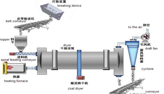 幹燥的濕物料由皮(pí)帶輸送機或鬥式提升機送到料鬥,然後(hòu)經料鬥的加料機(jī)通過加料管道進入加(jiā)料端。加料管道的斜(xié)度要大於物料的自然傾角,以便物料順利(lì)流入幹燥器內。幹燥器圓筒是一個與水平線略成傾斜的旋轉圓筒,物料從較高一端加入,載(zǎi)熱體由低端進入,與物料成逆流接(jiē)觸,也有載熱體和物料一起並流進入筒體(tǐ)的,隨著圓筒的轉(zhuǎn)動物料受重力作用運行到較底的一端。